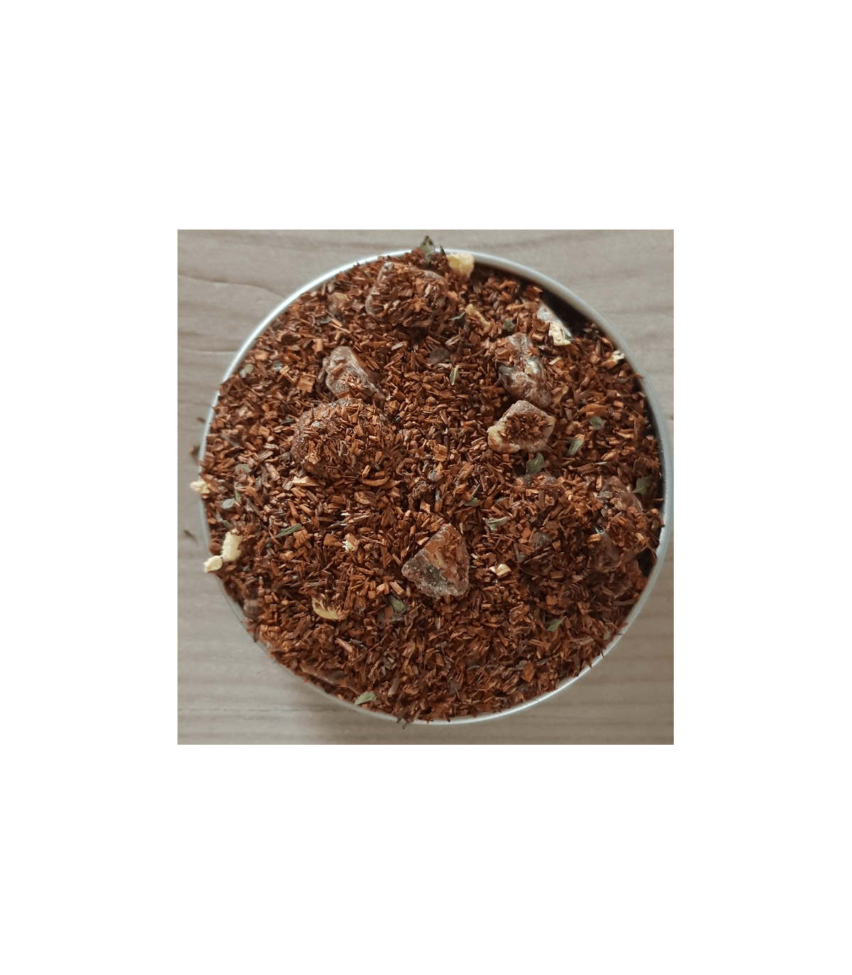 Rooibos naturel*, datte (datte, farine de riz)*, raisin (raisin, huile végétale)*, gingembre*, arôme naturel, morceaux de mangue*, papaye*, figue (figue, farine de riz)*, menthe poivrée*, mangue*, bourbon vanille*. *Issu de l'agriculture biologique