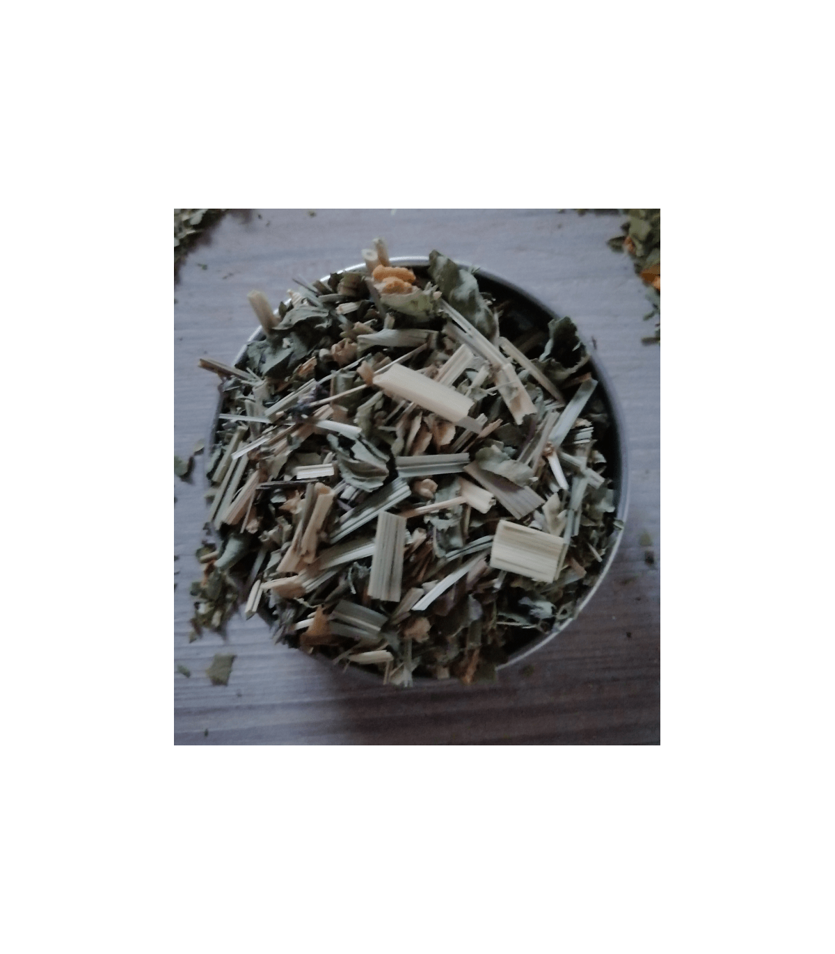 Citronnelle*, maté vert*, écorces de citron*, gingembre*, menthe poivrée*, ortie*, mélisse*, verveine*, reine des prés*, herbe de blé*, guarana*, racine de maca *, myrte citronnée*, feuilles de moringa*. *Issu de l‘agriculture biologique